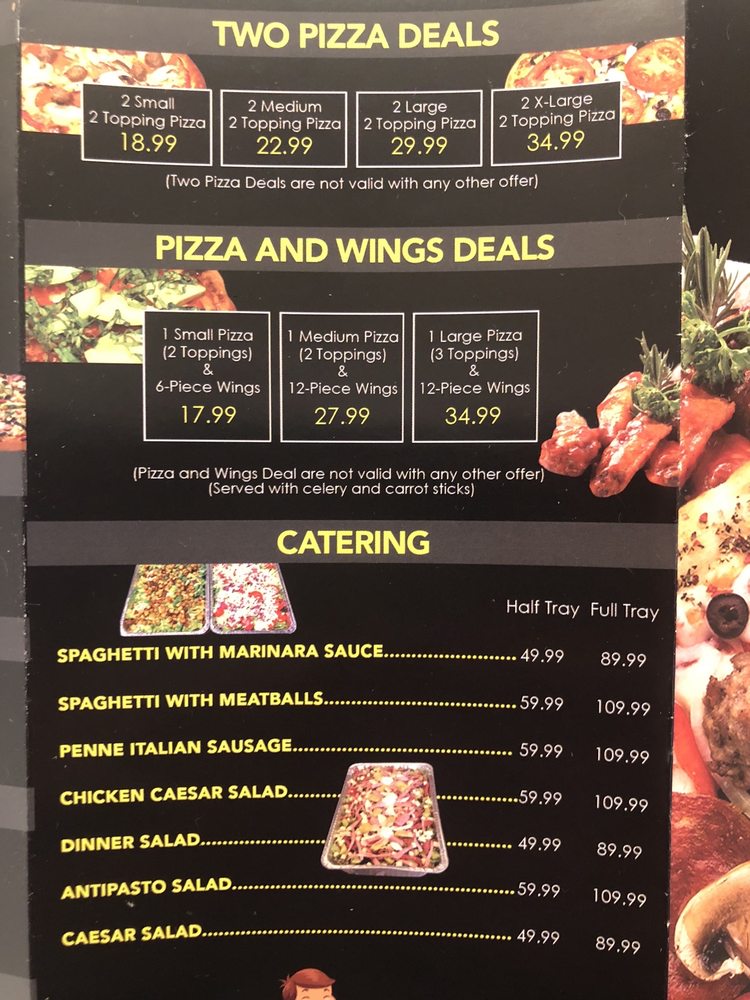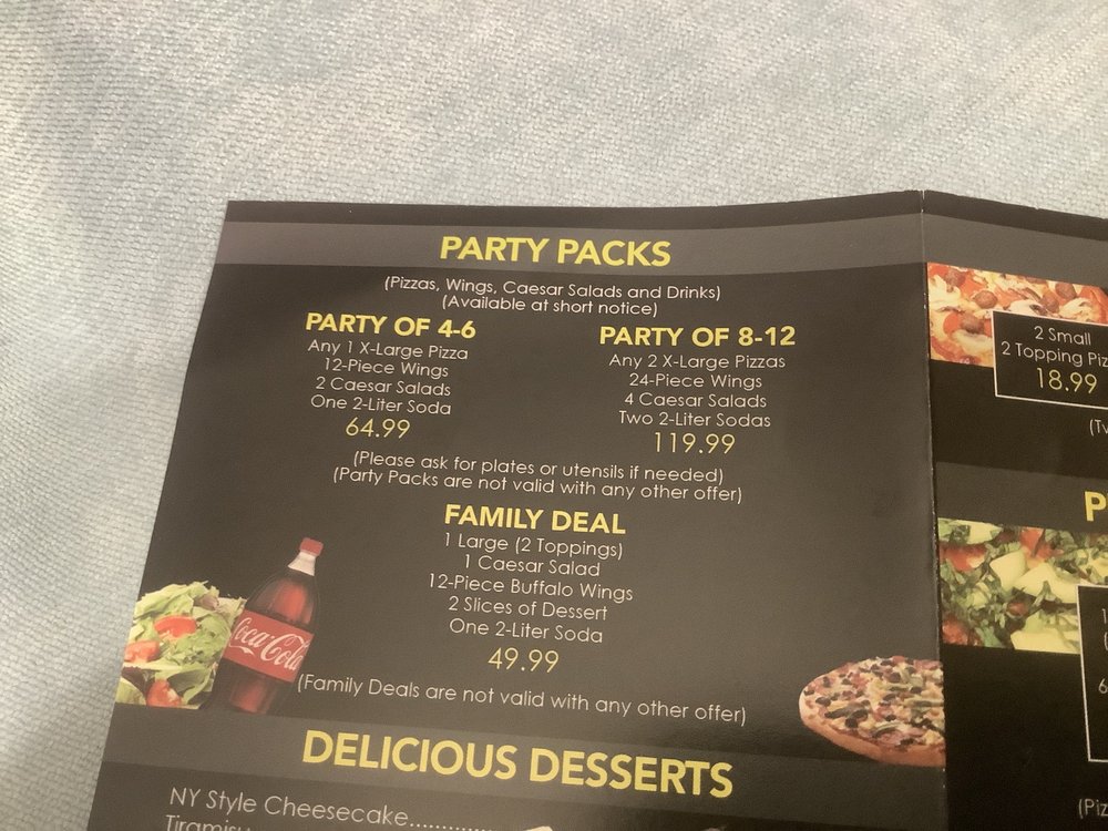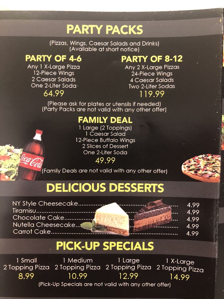 2 X large 2 topping pizza, 24 wings, 2 Caesar salad & 2.2 Liter Soda.